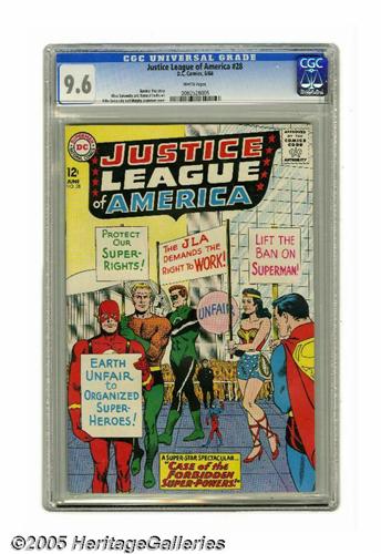 <B>Justice League of America #28 (DC, 1964) CGC NM+ 9.6 White pages.</B></I> Mike Sekowsky gives us one of the more bizarre covers of the JLA's run, featuring a superhero protest rally -- scrutinize our scan to see the Atom joining in, complete with protest balloon! And while you're scrutinizing that scan, note the excellent condition of this copy. The interior art is also by Sekowsky. Overstreet 2005 NM- 9.2 value = $210. CGC census 1/05: 2 in 9.6, none higher.