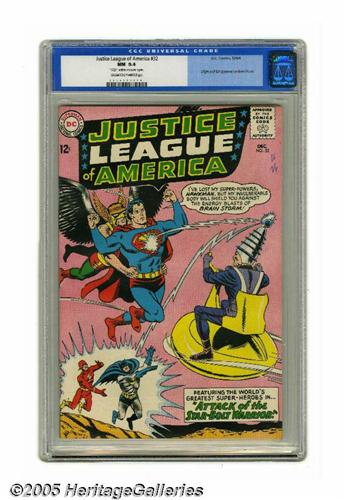 <B>Justice League of America #32 (DC, 1964) CGC NM 9.4 Cream to off-white pages.</B></I> Brain Storm was also known as the Master of Mind-Over-Matter; this is the first appearance for the villain, and his origin story's here as well. THe cover and interior art are by Mike Sekowsky. CGC notes, "'1026' written on cover in pen." Overstreet 2005 NM- 9.2 value = $140. CGC census 1/05: 5 in 9.4, 1 higher.