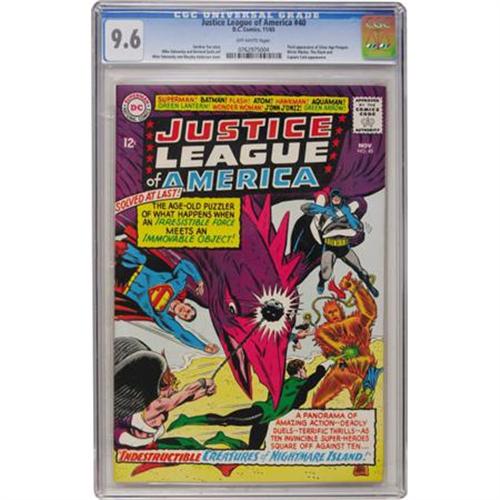 <B>Justice League of America #40 (DC, 1965) CGC NM+ 9.6 Off-white pages.</B></I> This book is tough in this grade! The issue has the third Silver Age appearance of the Penguin, and other baddies include the Mirror Master, the Shark, and Captain Cold. Mike Sekowsky is the artist. Overstreet 2007 NM- 9.2 value = $140. CGC census 9/07: 2 in 9.6, none higher.<BR><BR><b>Shipping:</b> Comics - Slabbed (certified) (<a target="_blank" href="http://www.heritageauctions.com/common/shipping.php">view shipping information</a>)