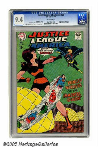 <B>Justice League of America #60 (DC, 1968) CGC NM 9.4.</B></I> Here's a sparkling NM example of this popular issue, featuring the curvaceous Queen Bee. Is it up to guest star Batgirl to save the day? Overstreet 2005 NM- 9.2 value = $90. CGC census 4/05: 11 in 9.4, 5 higher.