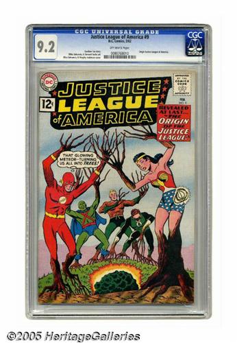 <B>Justice League of America #9 (DC, 1962) CGC NM- 9.2 Off-white pages.</B></I> Finally, the origin of the Justice League was revealed in this comic, something DC had never gotten around to in eight issues of this title and a few <B>The Brave and the Bold</B></I>s before that! The cover and interior art for this origin issue are by Mike Sekowsky. Overstreet 2005 NM- 9.2 value = $725. CGC census 5/05: 9 in 9.2, 1 higher.