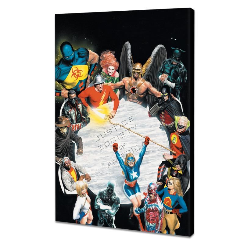 "Justice Society of America #1" is a limited edition giclee on canvas featuring art by Alex Ross from the 2007 comic. This piece comes gallery wrapped and includes a certificate of authenticity. Measures approximately 24" x 16" (image). This item requires special handling and may have a longer than usual turnaround.