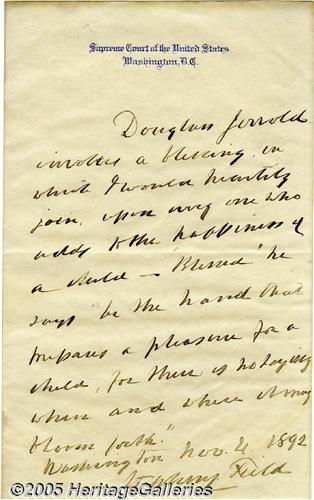<B>Justice Stephen J. Field Autograph Statement Signed</B></I> "Stephen J. Field" as Associate Justice, one page, 5" x 8". Supreme Court, Washington, D.C., November 4, 1892. On vellum. In full: "Douglass Jerrold invokes a blessing in which I would heartily join, upon every one who adds to the happiness of a child - 'Blessed,' he says, 'be the hand that prepares a pleasure for a child, for there is no saying when and where it may bloom forth.'" Field, appointed by President Abraham Lincoln, served on the Supreme Court from 1863-1897. Paper slightly rippled, lightly browned. Vertical fold at lower right corner touches the "F" in Field. <I>Accompanied by COA from PSA/DNA.</B></I>