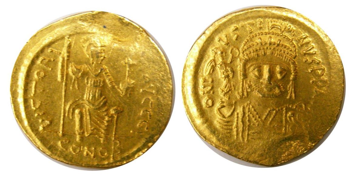 Justin II 565-578, AV Solidus. DN IVSTINVS PP AVG, helmeted facing bust, holding Victory on globus / VICTORIA AVCCCx, Constantinopolis enthroned holding sceptre and globus cruciger; CONOB in ex