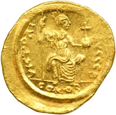 Justin II, 565-578. Gold Solidus (4.44 g) minted at Constantinople. Helmeted and cuirassed bust facing of Justin II with short beard, holding globe surmounted by Victory, and shield. Reverse: Constantinopolis seated, facing right, holding spear and globus cruciger. D.O. 1-3; S. 344. Lustrous; Extremely Fine.