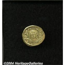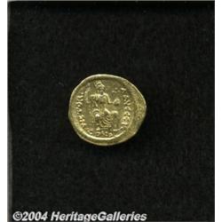<B>Justin II.</B></I> A.D. 565-578. AV solidus (21 mm, 4.42 g). Constantinople. Helmeted and cuirassed bust facing, holding globe surmounted by Victory / Constantinopolis seated facing, head turned to right, holding sceptre and globus cruciger; H/CONOB. DOC 4g; SB 345. XF. <BR><I>From the Geneva Collection.</B></I> <BR><BR><B>Important notice:</B> Heritage usually auctions material at the rate of 200-250 lots per hour. On some occasions eBay Live bid software or the Internet may not be able to keep up with the pace of the auction. We recommend placing a realistic absentee bid now as insurance to avoid disappointment. Occasionally the auctioneer may eliminate or reject an eBay Live bid, and the auctioneer may also reopen a lot after the close of the eBay live bidding (usually because we missed an audience bid), and may reject your bid even if it shows you as the winning bidder. By bidding via eBay Live, you agree that Heritage may award the lot to another bidder at its sole discretion under the circumstances described above or any other reasonable circumstances. Since eBay bids are not shown to us until we open the lot on the floor, we treat those bids just like floor bids. In most cases the floor responds before the eBay bid is presented to us, due to Internet lag time, so for consistency we have made it a policy that floor bids are always considered first over tie eBay live bids. Also please note that all Heritage lots purchased through eBay Live carry a 20% Buyer's Premium. Please make sure you read the Terms and Conditions before you bid.