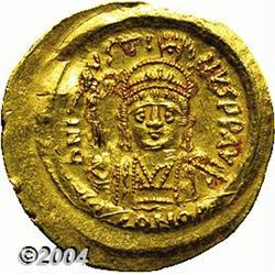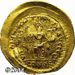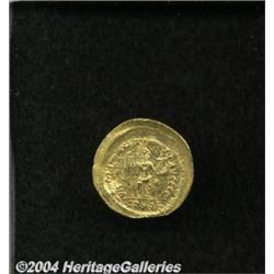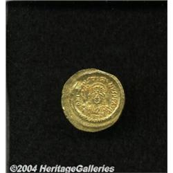 <B>Justin II.</B></I> A.D. 565-578. AV solidus (22 mm, 4.44 g). Constantinople. Helmeted and cuirassed bust facing, holding globe surmounted by Victory / Constantinopolis seated facing, head turned to right, holding sceptre and globus cruciger; (Theta)/CONOB. DOC 4h; SB 345. XF, obverse graffito, reverse double struck. <BR><I>From the Geneva Collection.</B></I> <BR><BR><B>Important notice:</B> Heritage usually auctions material at the rate of 200-250 lots per hour. On some occasions eBay Live bid software or the Internet may not be able to keep up with the pace of the auction. We recommend placing a realistic absentee bid now as insurance to avoid disappointment. Occasionally the auctioneer may eliminate or reject an eBay Live bid, and the auctioneer may also reopen a lot after the close of the eBay live bidding (usually because we missed an audience bid), and may reject your bid even if it shows you as the winning bidder. By bidding via eBay Live, you agree that Heritage may award the lot to another bidder at its sole discretion under the circumstances described above or any other reasonable circumstances. Since eBay bids are not shown to us until we open the lot on the floor, we treat those bids just like floor bids. In most cases the floor responds before the eBay bid is presented to us, due to Internet lag time, so for consistency we have made it a policy that floor bids are always considered first over tie eBay live bids. Also please note that all Heritage lots purchased through eBay Live carry a 20% Buyer's Premium. Please make sure you read the Terms and Conditions before you bid.