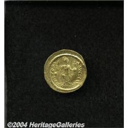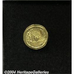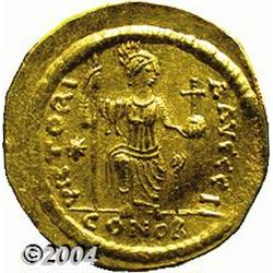 <B>Justin II.</B></I> A.D. 565-578. AV solidus (20 mm, 4.40 g). Constantinople. Helmeted and cuirassed bust facing, holding globe surmounted by Victory / Constantinopolis seated facing, head turned to right, holding sceptre and globus cruciger; star in left field; I/CONOB. DOC 5e; SB 346. XF. <BR><I>From the Geneva Collection.</B></I> <BR><BR><B>Important notice:</B> Heritage usually auctions material at the rate of 200-250 lots per hour. On some occasions eBay Live bid software or the Internet may not be able to keep up with the pace of the auction. We recommend placing a realistic absentee bid now as insurance to avoid disappointment. Occasionally the auctioneer may eliminate or reject an eBay Live bid, and the auctioneer may also reopen a lot after the close of the eBay live bidding (usually because we missed an audience bid), and may reject your bid even if it shows you as the winning bidder. By bidding via eBay Live, you agree that Heritage may award the lot to another bidder at its sole discretion under the circumstances described above or any other reasonable circumstances. Since eBay bids are not shown to us until we open the lot on the floor, we treat those bids just like floor bids. In most cases the floor responds before the eBay bid is presented to us, due to Internet lag time, so for consistency we have made it a policy that floor bids are always considered first over tie eBay live bids. Also please note that all Heritage lots purchased through eBay Live carry a 20% Buyer's Premium. Please make sure you read the Terms and Conditions before you bid.