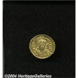 <B>Justin I.</B></I> A.D. 518-527. AV solidus (20 mm, 4.60 g). Constantinople, A.D. 519-527. Helmeted and cuirassed bust facing slightly right, holding spear over shoulder and shield decorated with horseman spearing a fallen enemy / Angel standing facing, holding long jewelled cross and globus cruciger; star in right field; S/CONOB. DOC 2f; SB 56. VF. Possibly the heaviest Byzantine solidus this cataloguer has ever handled! <BR><I>From the Geneva Collection.</B></I> <BR><BR><B>Important notice:</B> Heritage usually auctions material at the rate of 200-250 lots per hour. On some occasions eBay Live bid software or the Internet may not be able to keep up with the pace of the auction. We recommend placing a realistic absentee bid now as insurance to avoid disappointment. Occasionally the auctioneer may eliminate or reject an eBay Live bid, and the auctioneer may also reopen a lot after the close of the eBay live bidding (usually because we missed an audience bid), and may reject your bid even if it shows you as the winning bidder. By bidding via eBay Live, you agree that Heritage may award the lot to another bidder at its sole discretion under the circumstances described above or any other reasonable circumstances. Since eBay bids are not shown to us until we open the lot on the floor, we treat those bids just like floor bids. In most cases the floor responds before the eBay bid is presented to us, due to Internet lag time, so for consistency we have made it a policy that floor bids are always considered first over tie eBay live bids. Also please note that all Heritage lots purchased through eBay Live carry a 20% Buyer's Premium. Please make sure you read the Terms and Conditions before you bid.