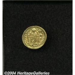 <B>Justin I.</B></I> A.D. 518-527. AV solidus (20 mm, 4.60 g). Constantinople, A.D. 519-527. Helmeted and cuirassed bust facing slightly right, holding spear over shoulder and shield decorated with horseman spearing a fallen enemy / Angel standing facing, holding long jewelled cross and globus cruciger; star in right field; S/CONOB. DOC 2f; SB 56. VF. Possibly the heaviest Byzantine solidus this cataloguer has ever handled! <BR><I>From the Geneva Collection.</B></I> <BR><BR><B>Important notice:</B> Heritage usually auctions material at the rate of 200-250 lots per hour. On some occasions eBay Live bid software or the Internet may not be able to keep up with the pace of the auction. We recommend placing a realistic absentee bid now as insurance to avoid disappointment. Occasionally the auctioneer may eliminate or reject an eBay Live bid, and the auctioneer may also reopen a lot after the close of the eBay live bidding (usually because we missed an audience bid), and may reject your bid even if it shows you as the winning bidder. By bidding via eBay Live, you agree that Heritage may award the lot to another bidder at its sole discretion under the circumstances described above or any other reasonable circumstances. Since eBay bids are not shown to us until we open the lot on the floor, we treat those bids just like floor bids. In most cases the floor responds before the eBay bid is presented to us, due to Internet lag time, so for consistency we have made it a policy that floor bids are always considered first over tie eBay live bids. Also please note that all Heritage lots purchased through eBay Live carry a 20% Buyer's Premium. Please make sure you read the Terms and Conditions before you bid.
