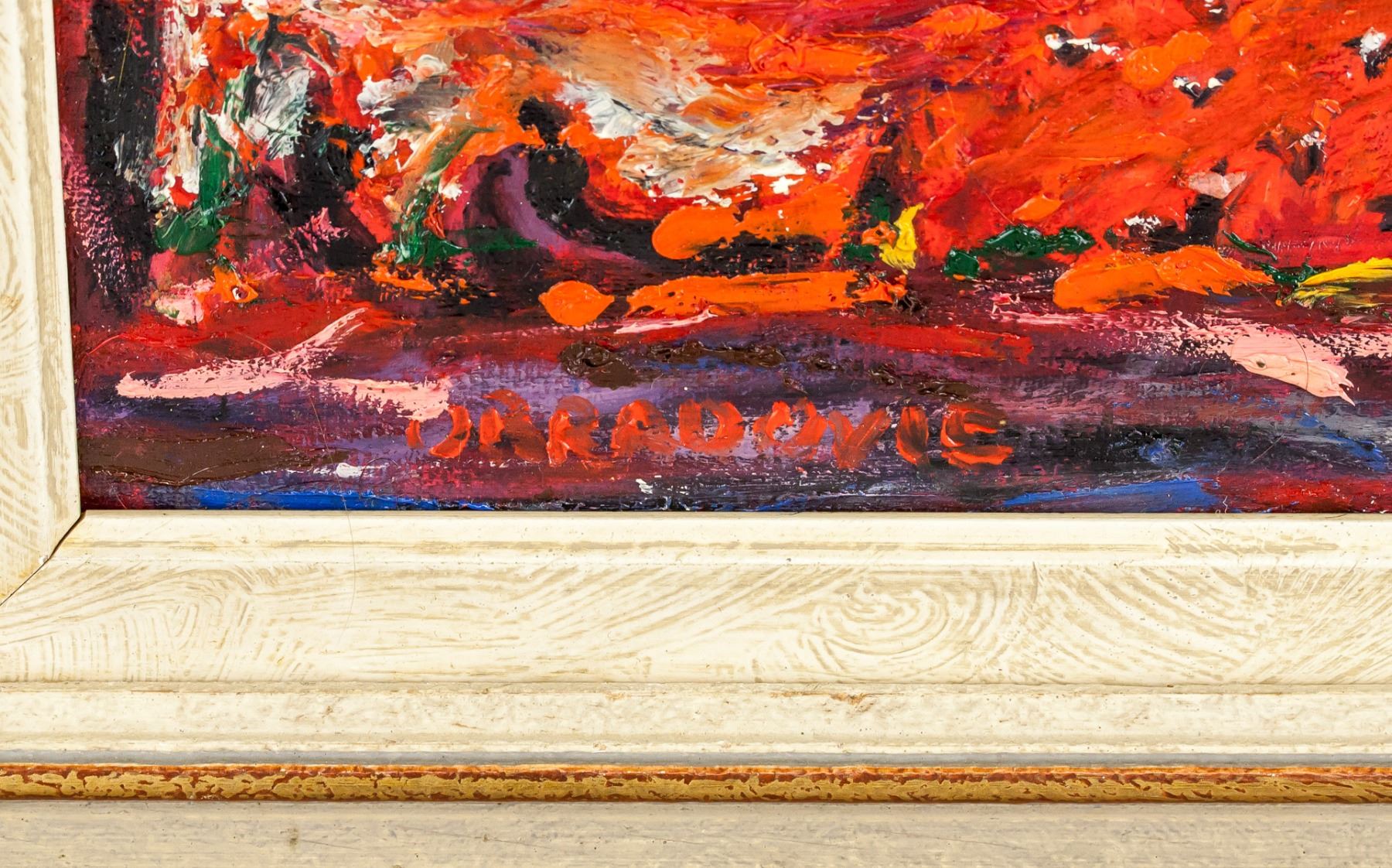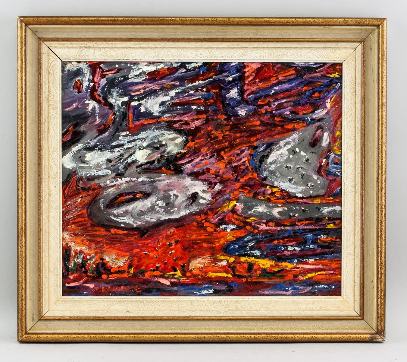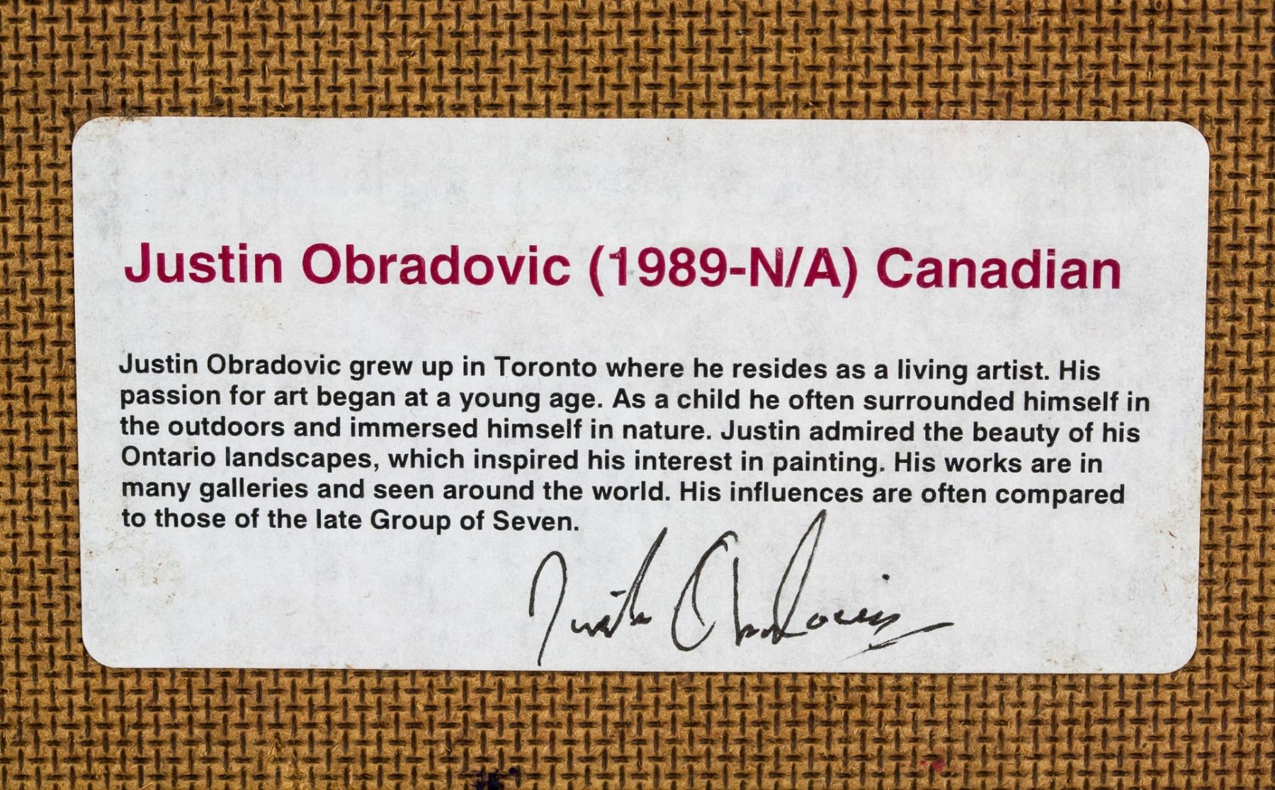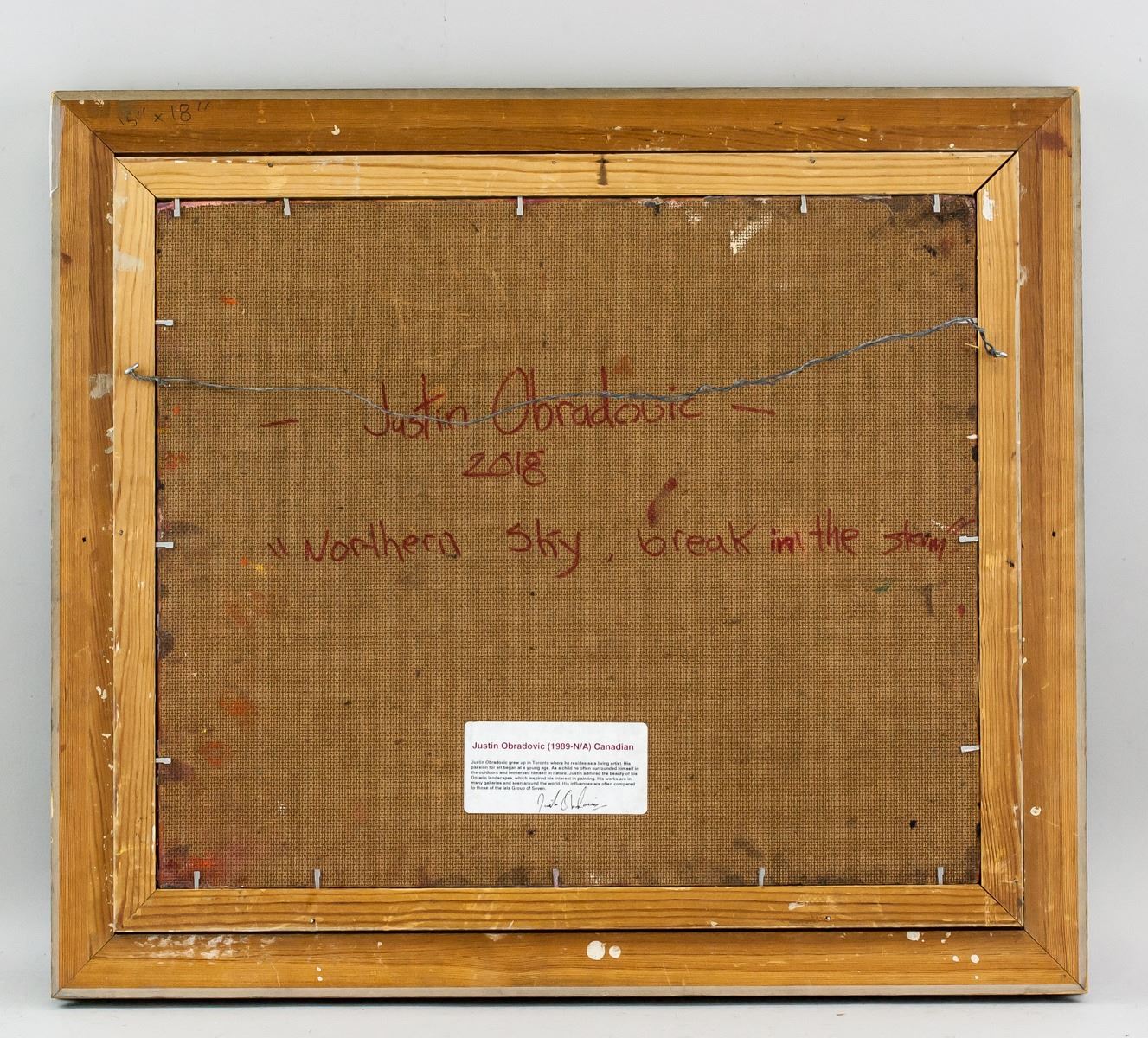 Oil on canvas, framed. Featuring abstract composition. Signed Obradovic in bottom left corner. Inscribed with "Justin Obradovic 2018 'Northern Sky, break in the storm"" on verso. Sticker affixed to verso reading "Justin Obradovic (1989-N/A) Canadian. Justin Obradovic grew up in Toronto where he resides as a living artist. Hist passion for art began at a young age. As a child he often surrounded himself in the outdoors and immersed himself in nature. Justin admired the beauty of his Ontario landscapes, which inspired his interest in painting. His works are in many galleries and seen around the world. His influences are often compared to those of the late Group of Seven." 8 x 44 cm (14.9 x 17.3 in), Frame: 51 x 58 cm (20 x 22.8 in). PROVENANCE: Received from artist. 3