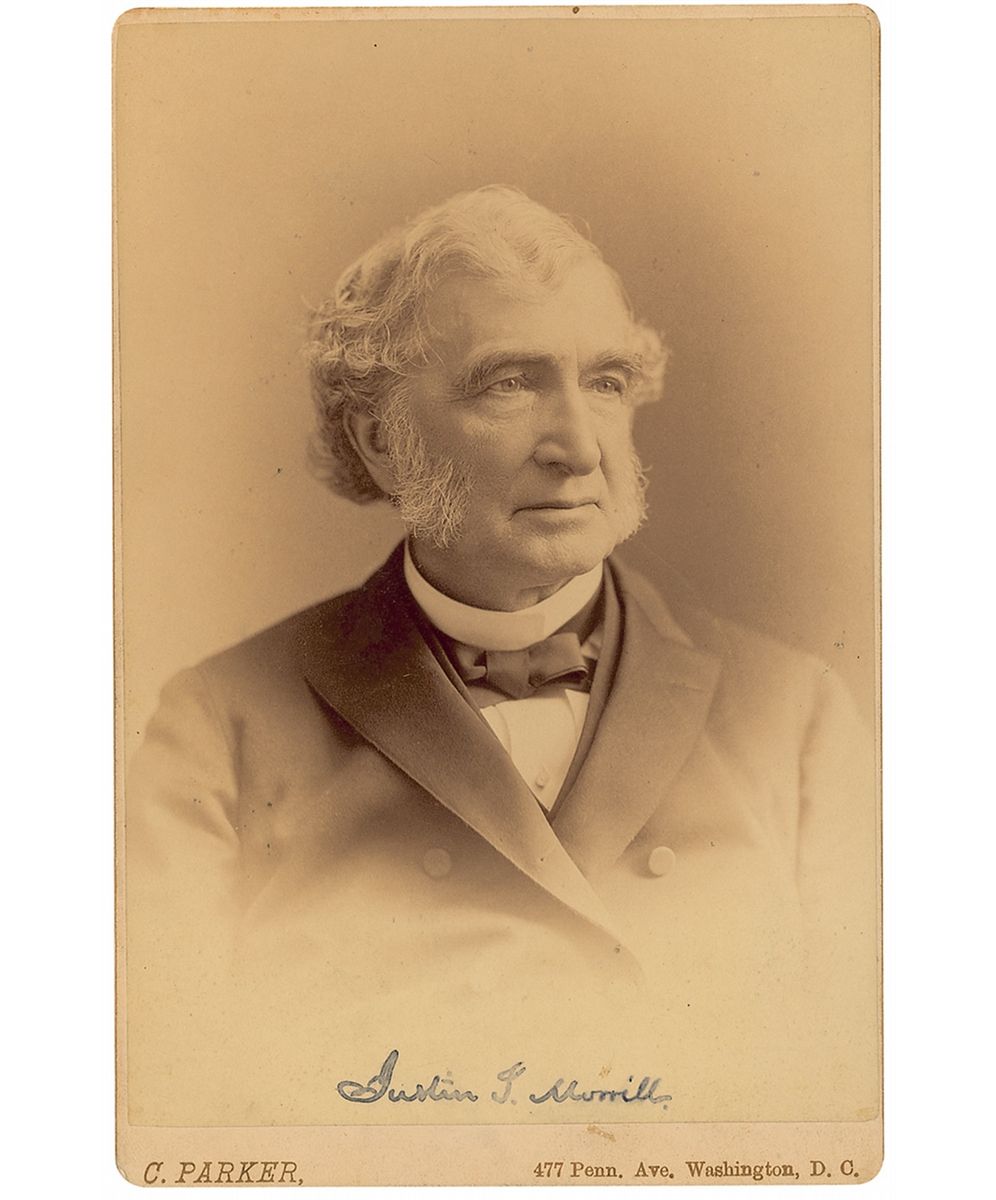 Congressman and senator from Vermont (1810–1898) who authored the Morrill Land–Grant Colleges Act, which provided federal funding for many public colleges and universities. Original 4.25 x 6.5 cabinet photo by C. Parker of Washington, signed at the bottom of the image in black ink, “Justin S. Morrill.” In very good condition, with some irregular adhesion and brushing to the signature, and a skinned back.