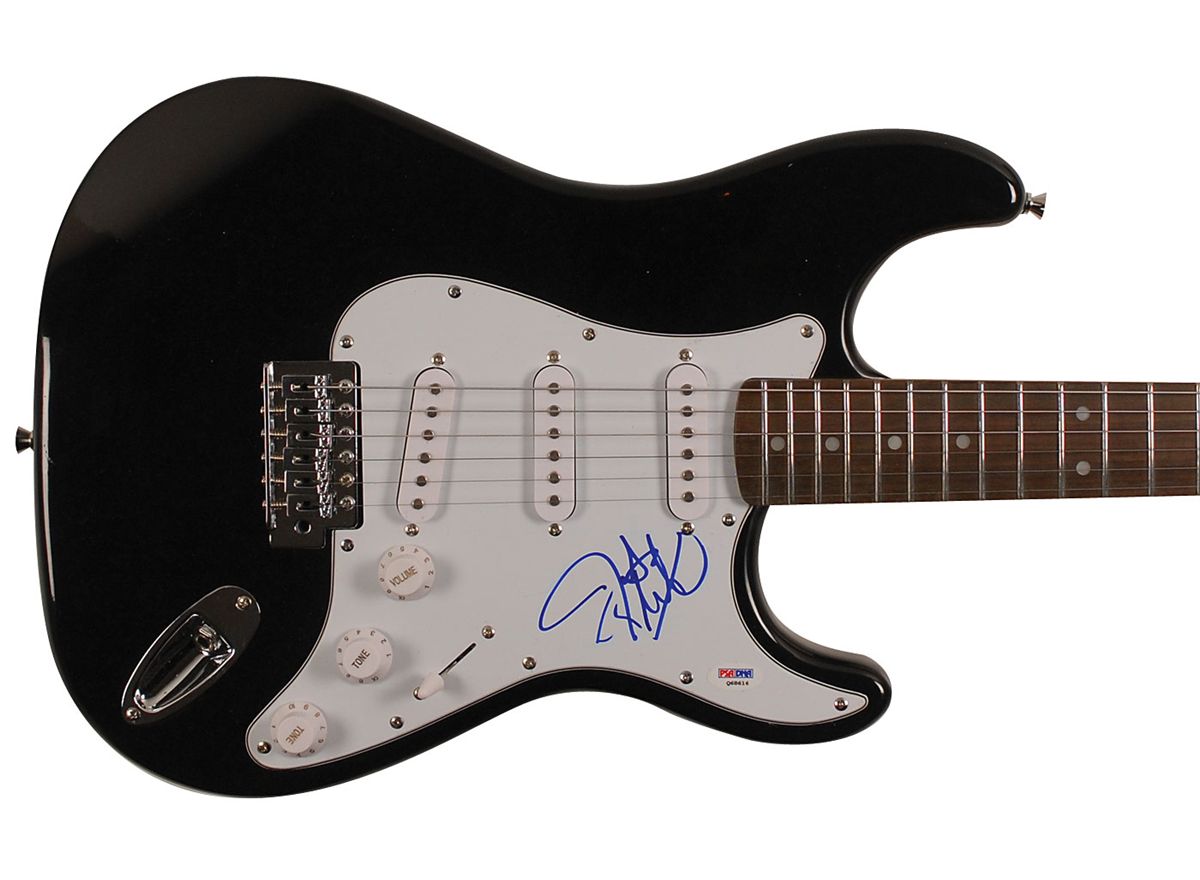 Black-bodied Stedman Pro ‘stratocaster-style’ electric guitar, signed on the white pickguard in blue felt tip. In fine condition, with a PSA/DNA authentication label affixed to pickguard. Accompanied by a certificate of authenticity from PSA/DNA. Oversize