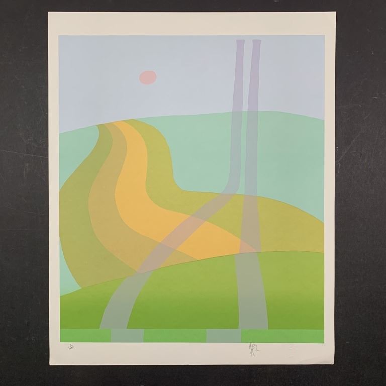 A limited edition print by Justine Nunoz, signed lower right and numbered 3/100 lower left. This piece is of a green and yellow pathway, going off into the distance. This piece is in near excellent condition with a small crease upper right corner, miniscule crease lower left corner, and a wrinkle lower right corner.