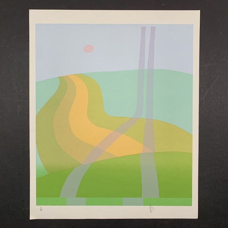 A limited edition print by Justine Nunoz, signed lower right and numbered 11/100 lower left. This piece is of a green and yellow pathway, going off into the distance. This piece is in near excellent condition with a very minor wrinkle/crease upper right corner, and a miniscule crease lower left corner.