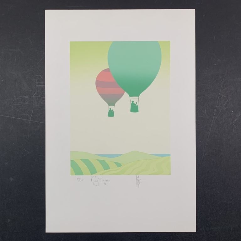 Justine Nunoz's "Gay Dippers" limited edition print, signed lower middle, and titled and numbered 206/300 lower left. This piece is of two people, in two hot balloons, flying through the air. This piece is in excellent condition.