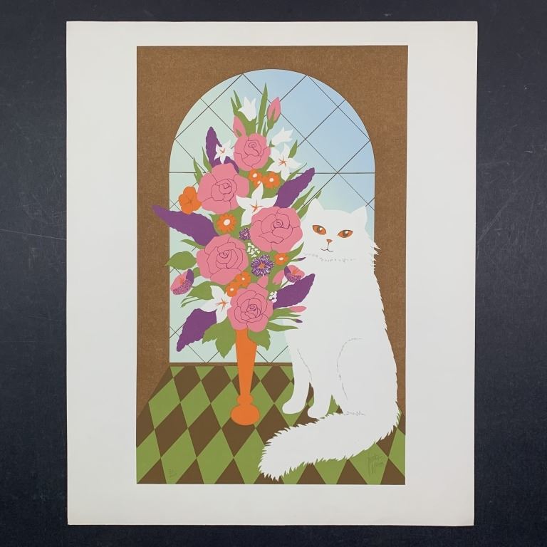Justine Nunoz's "Kitty's Bouqet" limited edition print, signed lower right and numbered 32/200 lower left. This piece is of a white car, sitting beside a bouquet of flowers, in front of a window. This piece is in near excellent condition with an extremely minor wrinkle lower right corner.