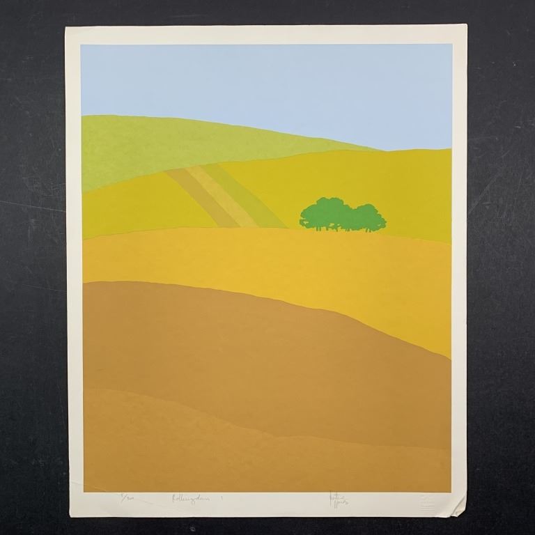Justine Nunoz's "Rolling Down" limited edition print, signed lower right and numbered 5/300 lower left. This piece is of a brown and yellow field, with some green trees, against a blue sky. This piece is in good excellent condition with a crease upper right corner, crease lower right corner, major crease lower left corner, a minor crease upper left corner, and a miniscule incision at right.