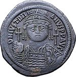 Justinian I (527-565). Follis, Constantinople. Obv. DN IVSTINIANVS PP AVG. Helmeted and cuirassed bust facing, holding globus cruciger and shield; cross to right. Rev. Large M between A/N/N/O and XII; cross above ; ? below; CON in exergue. D.O. 37-61. Sear 163. AE. g. 22.79 mm. 42.50 EF. In excellent condition for the issue. Dark green patina. Impero Bizantino. D.O. 37-61. Sear 163. AE. g. 22.79 mm. 42.50