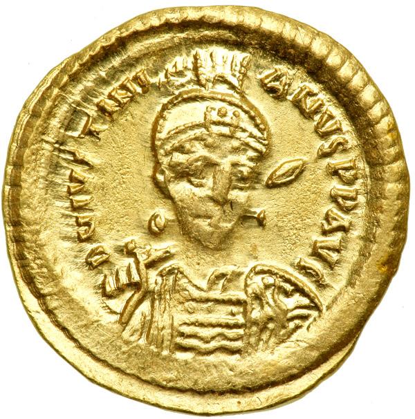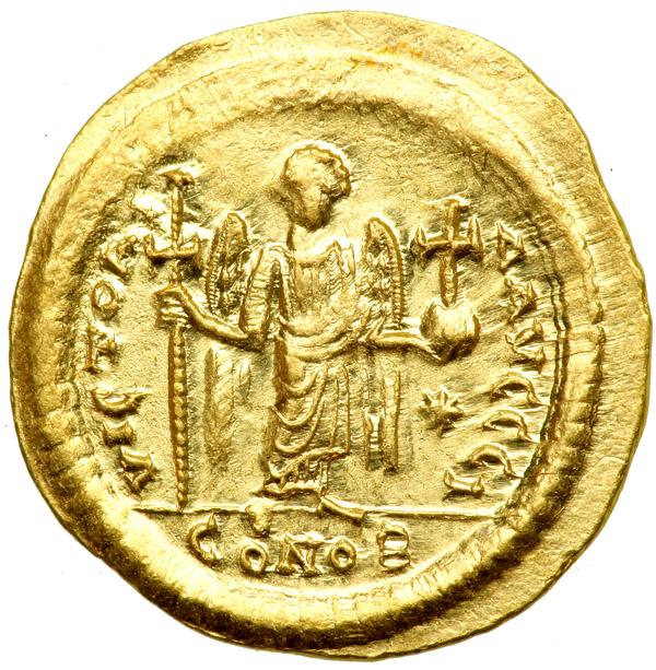 Justinian I, 527-565. Gold Solidus (4.42 g) minted at Constantinople. Helmeted and cuirassed bust three-quarter facing to right of Justinian I. Reverse: Angel holding long cross and globus cruciger; star in lower right field. D.O. 3i; S. 137. Some striking problems, lustrous. About Extremely Fine.