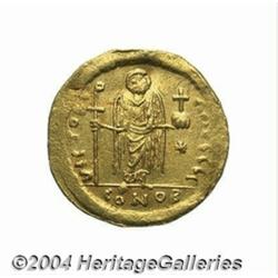 Justinian I. A.D. 527-565. AV solidus (20 mm, 4.31 g). Constantinople, A.D. 545-565. Diademed, helmeted and cuirassed bust facing, holding globus cruciger and shield decorated with a horseman spearing fallen enemy / Angel standing facing, holding long staff surmounted by a Christogram in right hand, globus cruciger in left; star in right field; (Gamma)/CONOB. DOC 9c; SB 140. Good VF, clipped.From the Morris Geiger Collection. Important notice: Heritage usually auctions material at the rate of 200-250 lots per hour. On some occasions eBay Live bid software or the Internet may not be able to keep up with the pace of the auction. We recommend placing a realistic absentee bid now as insurance to avoid disappointment. Occasionally the auctioneer may eliminate or reject an eBay Live bid, and the auctioneer may also reopen a lot after the close of the eBay live bidding (usually because we missed an audience bid), and may reject your bid even if it shows you as the winning bidder. By bidding via eBay Live, you agree that Heritage may award the lot to another bidder at its sole discretion under the circumstances described above or any other reasonable circumstances. Also please note that all Heritage lots purchased through eBay Live carry a 20% Buyer's Premium. Please make sure you read the Terms and Conditions before you bid.