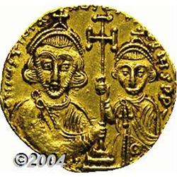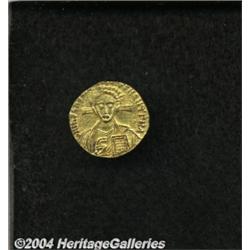 <B>Justinian II.</B></I> Second Reign, A.D. 705-711. AV solidus (20 mm, 4.22 g). Constantinople. Facing bust of Christ, holding Gospels / Crowned busts of Justinian and Tiberius, holding cross potent on steps between them. DOC 2a; SB 1414. XF, clipped. <BR><I>From the Geneva Collection.</B></I> <BR><BR><B>Important notice:</B> Heritage usually auctions material at the rate of 200-250 lots per hour. On some occasions eBay Live bid software or the Internet may not be able to keep up with the pace of the auction. We recommend placing a realistic absentee bid now as insurance to avoid disappointment. Occasionally the auctioneer may eliminate or reject an eBay Live bid, and the auctioneer may also reopen a lot after the close of the eBay live bidding (usually because we missed an audience bid), and may reject your bid even if it shows you as the winning bidder. By bidding via eBay Live, you agree that Heritage may award the lot to another bidder at its sole discretion under the circumstances described above or any other reasonable circumstances. Since eBay bids are not shown to us until we open the lot on the floor, we treat those bids just like floor bids. In most cases the floor responds before the eBay bid is presented to us, due to Internet lag time, so for consistency we have made it a policy that floor bids are always considered first over tie eBay live bids. Also please note that all Heritage lots purchased through eBay Live carry a 20% Buyer's Premium. Please make sure you read the Terms and Conditions before you bid.