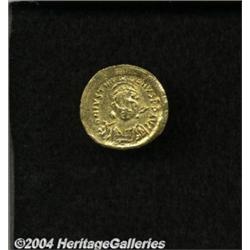 <B>Justinian I.</B></I> A.D. 527-565. AV solidus (21 mm, 4.28 g). Constantinople, A.D. 527-538. Helmeted and cuirassed bust facing slightly right, holding spear over shoulder and shield decorated with horseman spearing a fallen enemy / Angel standing facing, holding long jewelled cross and globus cruciger; star in right field; (Delta)/CONOB. DOC 3d; SB 137. VF, obverse graffito, flat strike on head. <BR><I>From the Geneva Collection.</B></I> <BR><BR><B>Important notice:</B> Heritage usually auctions material at the rate of 200-250 lots per hour. On some occasions eBay Live bid software or the Internet may not be able to keep up with the pace of the auction. We recommend placing a realistic absentee bid now as insurance to avoid disappointment. Occasionally the auctioneer may eliminate or reject an eBay Live bid, and the auctioneer may also reopen a lot after the close of the eBay live bidding (usually because we missed an audience bid), and may reject your bid even if it shows you as the winning bidder. By bidding via eBay Live, you agree that Heritage may award the lot to another bidder at its sole discretion under the circumstances described above or any other reasonable circumstances. Since eBay bids are not shown to us until we open the lot on the floor, we treat those bids just like floor bids. In most cases the floor responds before the eBay bid is presented to us, due to Internet lag time, so for consistency we have made it a policy that floor bids are always considered first over tie eBay live bids. Also please note that all Heritage lots purchased through eBay Live carry a 20% Buyer's Premium. Please make sure you read the Terms and Conditions before you bid.