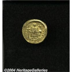<B>Justinian I.</B></I> A.D. 527-565. AV solidus (21 mm, 4.28 g). Constantinople, A.D. 527-538. Helmeted and cuirassed bust facing slightly right, holding spear over shoulder and shield decorated with horseman spearing a fallen enemy / Angel standing facing, holding long jewelled cross and globus cruciger; star in right field; (Delta)/CONOB. DOC 3d; SB 137. VF, obverse graffito, flat strike on head. <BR><I>From the Geneva Collection.</B></I> <BR><BR><B>Important notice:</B> Heritage usually auctions material at the rate of 200-250 lots per hour. On some occasions eBay Live bid software or the Internet may not be able to keep up with the pace of the auction. We recommend placing a realistic absentee bid now as insurance to avoid disappointment. Occasionally the auctioneer may eliminate or reject an eBay Live bid, and the auctioneer may also reopen a lot after the close of the eBay live bidding (usually because we missed an audience bid), and may reject your bid even if it shows you as the winning bidder. By bidding via eBay Live, you agree that Heritage may award the lot to another bidder at its sole discretion under the circumstances described above or any other reasonable circumstances. Since eBay bids are not shown to us until we open the lot on the floor, we treat those bids just like floor bids. In most cases the floor responds before the eBay bid is presented to us, due to Internet lag time, so for consistency we have made it a policy that floor bids are always considered first over tie eBay live bids. Also please note that all Heritage lots purchased through eBay Live carry a 20% Buyer's Premium. Please make sure you read the Terms and Conditions before you bid.