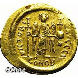 <B>Justinian I.</B></I> A.D. 527-565. AV solidus (22 mm, 4.48 g). Constantinople, A.D. 527-538. Helmeted and cuirassed bust facing slightly right, holding spear over shoulder and shield decorated with horseman spearing a fallen enemy / Angel standing facing, holding long jewelled cross and globus cruciger; star in right field; I/CONOB. DOC 3i; SB 137. VF. <BR><I>From the Geneva Collection.</B></I> <BR><BR><B>Important notice:</B> Heritage usually auctions material at the rate of 200-250 lots per hour. On some occasions eBay Live bid software or the Internet may not be able to keep up with the pace of the auction. We recommend placing a realistic absentee bid now as insurance to avoid disappointment. Occasionally the auctioneer may eliminate or reject an eBay Live bid, and the auctioneer may also reopen a lot after the close of the eBay live bidding (usually because we missed an audience bid), and may reject your bid even if it shows you as the winning bidder. By bidding via eBay Live, you agree that Heritage may award the lot to another bidder at its sole discretion under the circumstances described above or any other reasonable circumstances. Since eBay bids are not shown to us until we open the lot on the floor, we treat those bids just like floor bids. In most cases the floor responds before the eBay bid is presented to us, due to Internet lag time, so for consistency we have made it a policy that floor bids are always considered first over tie eBay live bids. Also please note that all Heritage lots purchased through eBay Live carry a 20% Buyer's Premium. Please make sure you read the Terms and Conditions before you bid.