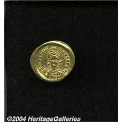 <B>Justinian I.</B></I> A.D. 527-565. AV solidus (22 mm, 4.48 g). Constantinople, A.D. 527-538. Helmeted and cuirassed bust facing slightly right, holding spear over shoulder and shield decorated with horseman spearing a fallen enemy / Angel standing facing, holding long jewelled cross and globus cruciger; star in right field; I/CONOB. DOC 3i; SB 137. VF. <BR><I>From the Geneva Collection.</B></I> <BR><BR><B>Important notice:</B> Heritage usually auctions material at the rate of 200-250 lots per hour. On some occasions eBay Live bid software or the Internet may not be able to keep up with the pace of the auction. We recommend placing a realistic absentee bid now as insurance to avoid disappointment. Occasionally the auctioneer may eliminate or reject an eBay Live bid, and the auctioneer may also reopen a lot after the close of the eBay live bidding (usually because we missed an audience bid), and may reject your bid even if it shows you as the winning bidder. By bidding via eBay Live, you agree that Heritage may award the lot to another bidder at its sole discretion under the circumstances described above or any other reasonable circumstances. Since eBay bids are not shown to us until we open the lot on the floor, we treat those bids just like floor bids. In most cases the floor responds before the eBay bid is presented to us, due to Internet lag time, so for consistency we have made it a policy that floor bids are always considered first over tie eBay live bids. Also please note that all Heritage lots purchased through eBay Live carry a 20% Buyer's Premium. Please make sure you read the Terms and Conditions before you bid.
