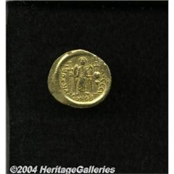 <B>Justinian I.</B></I> A.D. 527-565. AV solidus (22 mm, 4.48 g). Constantinople, A.D. 527-538. Helmeted and cuirassed bust facing slightly right, holding spear over shoulder and shield decorated with horseman spearing a fallen enemy / Angel standing facing, holding long jewelled cross and globus cruciger; star in right field; I/CONOB. DOC 3i; SB 137. VF. <BR><I>From the Geneva Collection.</B></I> <BR><BR><B>Important notice:</B> Heritage usually auctions material at the rate of 200-250 lots per hour. On some occasions eBay Live bid software or the Internet may not be able to keep up with the pace of the auction. We recommend placing a realistic absentee bid now as insurance to avoid disappointment. Occasionally the auctioneer may eliminate or reject an eBay Live bid, and the auctioneer may also reopen a lot after the close of the eBay live bidding (usually because we missed an audience bid), and may reject your bid even if it shows you as the winning bidder. By bidding via eBay Live, you agree that Heritage may award the lot to another bidder at its sole discretion under the circumstances described above or any other reasonable circumstances. Since eBay bids are not shown to us until we open the lot on the floor, we treat those bids just like floor bids. In most cases the floor responds before the eBay bid is presented to us, due to Internet lag time, so for consistency we have made it a policy that floor bids are always considered first over tie eBay live bids. Also please note that all Heritage lots purchased through eBay Live carry a 20% Buyer's Premium. Please make sure you read the Terms and Conditions before you bid.