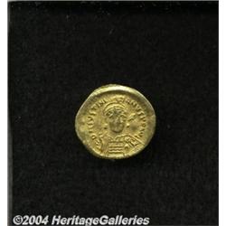 <B>Justinian I.</B></I> A.D. 527-565. AV solidus (21 mm, 4.39 g). Constantinople, A.D. 527-538. Helmeted and cuirassed bust facing slightly right, holding spear over shoulder and shield decorated with horseman spearing a fallen enemy / Angel standing facing, holding long jewelled cross and globus cruciger; star in right field; I/CONOB. DOC 3i; SB 137. Near VF. <BR><I>From the Geneva Collection.</B></I> <BR><BR><B>Important notice:</B> Heritage usually auctions material at the rate of 200-250 lots per hour. On some occasions eBay Live bid software or the Internet may not be able to keep up with the pace of the auction. We recommend placing a realistic absentee bid now as insurance to avoid disappointment. Occasionally the auctioneer may eliminate or reject an eBay Live bid, and the auctioneer may also reopen a lot after the close of the eBay live bidding (usually because we missed an audience bid), and may reject your bid even if it shows you as the winning bidder. By bidding via eBay Live, you agree that Heritage may award the lot to another bidder at its sole discretion under the circumstances described above or any other reasonable circumstances. Since eBay bids are not shown to us until we open the lot on the floor, we treat those bids just like floor bids. In most cases the floor responds before the eBay bid is presented to us, due to Internet lag time, so for consistency we have made it a policy that floor bids are always considered first over tie eBay live bids. Also please note that all Heritage lots purchased through eBay Live carry a 20% Buyer's Premium. Please make sure you read the Terms and Conditions before you bid.