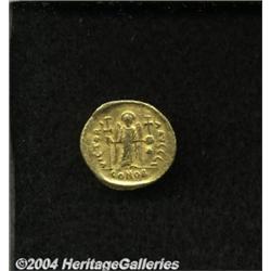 <B>Justinian I.</B></I> A.D. 527-565. AV solidus (21 mm, 4.39 g). Constantinople, A.D. 527-538. Helmeted and cuirassed bust facing slightly right, holding spear over shoulder and shield decorated with horseman spearing a fallen enemy / Angel standing facing, holding long jewelled cross and globus cruciger; star in right field; I/CONOB. DOC 3i; SB 137. Near VF. <BR><I>From the Geneva Collection.</B></I> <BR><BR><B>Important notice:</B> Heritage usually auctions material at the rate of 200-250 lots per hour. On some occasions eBay Live bid software or the Internet may not be able to keep up with the pace of the auction. We recommend placing a realistic absentee bid now as insurance to avoid disappointment. Occasionally the auctioneer may eliminate or reject an eBay Live bid, and the auctioneer may also reopen a lot after the close of the eBay live bidding (usually because we missed an audience bid), and may reject your bid even if it shows you as the winning bidder. By bidding via eBay Live, you agree that Heritage may award the lot to another bidder at its sole discretion under the circumstances described above or any other reasonable circumstances. Since eBay bids are not shown to us until we open the lot on the floor, we treat those bids just like floor bids. In most cases the floor responds before the eBay bid is presented to us, due to Internet lag time, so for consistency we have made it a policy that floor bids are always considered first over tie eBay live bids. Also please note that all Heritage lots purchased through eBay Live carry a 20% Buyer's Premium. Please make sure you read the Terms and Conditions before you bid.