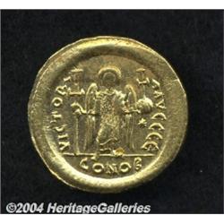 <B>Justinian I.</B></I> A.D. 527-565. AV solidus (21 mm, 4.41 g). Constantinople, A.D. 538-545. Helmeted and cuirassed bust facing, holding globus cruciger and shield decorated with horseman spearing a fallen enemy / Angel standing facing, holding long cross and globus cruciger; star in right field; E/CONOB. DOC 7; SB 138. Good VF, central striking weakness.<BR><I>From the Geneva Collection.</B></I> <BR><BR><B>Important notice:</B> Heritage usually auctions material at the rate of 200-250 lots per hour. On some occasions eBay Live bid software or the Internet may not be able to keep up with the pace of the auction. We recommend placing a realistic absentee bid now as insurance to avoid disappointment. Occasionally the auctioneer may eliminate or reject an eBay Live bid, and the auctioneer may also reopen a lot after the close of the eBay live bidding (usually because we missed an audience bid), and may reject your bid even if it shows you as the winning bidder. By bidding via eBay Live, you agree that Heritage may award the lot to another bidder at its sole discretion under the circumstances described above or any other reasonable circumstances. Since eBay bids are not shown to us until we open the lot on the floor, we treat those bids just like floor bids. In most cases the floor responds before the eBay bid is presented to us, due to Internet lag time, so for consistency we have made it a policy that floor bids are always considered first over tie eBay live bids. Also please note that all Heritage lots purchased through eBay Live carry a 20% Buyer's Premium. Please make sure you read the Terms and Conditions before you bid.