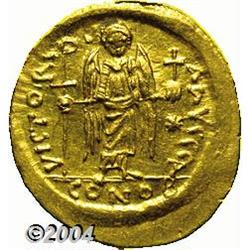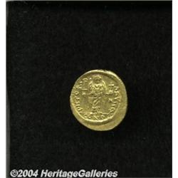 <B>Justinian I.</B></I> A.D. 527-565. AV solidus (20 mm, 4.44 g). Constantinople, A.D. 545-565. Helmeted and cuirassed bust facing, holding globus cruciger and shield decorated with horseman spearing a fallen enemy / Angel standing facing, holding long P-headed cross and globus cruciger; star in right field; A/CONOB. DOC 9a; SB 140. Near XF. <BR><I>From the Geneva Collection.</B></I> <BR><BR><B>Important notice:</B> Heritage usually auctions material at the rate of 200-250 lots per hour. On some occasions eBay Live bid software or the Internet may not be able to keep up with the pace of the auction. We recommend placing a realistic absentee bid now as insurance to avoid disappointment. Occasionally the auctioneer may eliminate or reject an eBay Live bid, and the auctioneer may also reopen a lot after the close of the eBay live bidding (usually because we missed an audience bid), and may reject your bid even if it shows you as the winning bidder. By bidding via eBay Live, you agree that Heritage may award the lot to another bidder at its sole discretion under the circumstances described above or any other reasonable circumstances. Since eBay bids are not shown to us until we open the lot on the floor, we treat those bids just like floor bids. In most cases the floor responds before the eBay bid is presented to us, due to Internet lag time, so for consistency we have made it a policy that floor bids are always considered first over tie eBay live bids. Also please note that all Heritage lots purchased through eBay Live carry a 20% Buyer's Premium. Please make sure you read the Terms and Conditions before you bid.