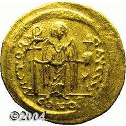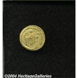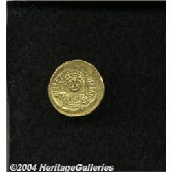 <B>Justinian I.</B></I> A.D. 527-565. AV solidus (20 mm, 4.46 g). Constantinople, A.D. 545-565. Helmeted and cuirassed bust facing, holding globus cruciger and shield decorated with horseman spearing a fallen enemy / Angel standing facing, holding long P-headed cross and globus cruciger; star in right field; S/CONOB. DOC 9f; SB 140. XF. <BR><I>From the Geneva Collection.</B></I> <BR><BR><B>Important notice:</B> Heritage usually auctions material at the rate of 200-250 lots per hour. On some occasions eBay Live bid software or the Internet may not be able to keep up with the pace of the auction. We recommend placing a realistic absentee bid now as insurance to avoid disappointment. Occasionally the auctioneer may eliminate or reject an eBay Live bid, and the auctioneer may also reopen a lot after the close of the eBay live bidding (usually because we missed an audience bid), and may reject your bid even if it shows you as the winning bidder. By bidding via eBay Live, you agree that Heritage may award the lot to another bidder at its sole discretion under the circumstances described above or any other reasonable circumstances. Since eBay bids are not shown to us until we open the lot on the floor, we treat those bids just like floor bids. In most cases the floor responds before the eBay bid is presented to us, due to Internet lag time, so for consistency we have made it a policy that floor bids are always considered first over tie eBay live bids. Also please note that all Heritage lots purchased through eBay Live carry a 20% Buyer's Premium. Please make sure you read the Terms and Conditions before you bid.