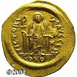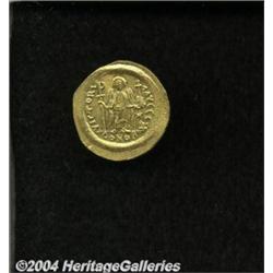 <B>Justinian I.</B></I> A.D. 527-565. AV solidus (21 mm, 4.40 g). Constantinople, A.D. 545-565. Helmeted and cuirassed bust facing, holding globus cruciger and shield decorated with horseman spearing a fallen enemy / Angel standing facing, holding long P-headed cross and globus cruciger; star in right field; H/CONOB. DOC 9h; SB 140. Superb XF. <BR><I>From the Geneva Collection.</B></I> <BR><BR><B>Important notice:</B> Heritage usually auctions material at the rate of 200-250 lots per hour. On some occasions eBay Live bid software or the Internet may not be able to keep up with the pace of the auction. We recommend placing a realistic absentee bid now as insurance to avoid disappointment. Occasionally the auctioneer may eliminate or reject an eBay Live bid, and the auctioneer may also reopen a lot after the close of the eBay live bidding (usually because we missed an audience bid), and may reject your bid even if it shows you as the winning bidder. By bidding via eBay Live, you agree that Heritage may award the lot to another bidder at its sole discretion under the circumstances described above or any other reasonable circumstances. Since eBay bids are not shown to us until we open the lot on the floor, we treat those bids just like floor bids. In most cases the floor responds before the eBay bid is presented to us, due to Internet lag time, so for consistency we have made it a policy that floor bids are always considered first over tie eBay live bids. Also please note that all Heritage lots purchased through eBay Live carry a 20% Buyer's Premium. Please make sure you read the Terms and Conditions before you bid.