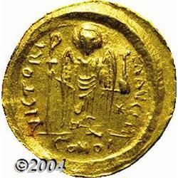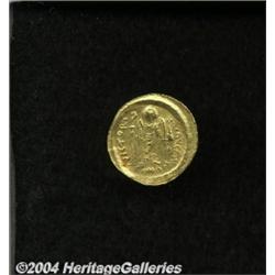 <B>Justinian I.</B></I> A.D. 527-565. AV solidus (20 mm, 3.87 g). Constantinople, A.D. 545-565. Helmeted and cuirassed bust facing, holding globus cruciger and shield decorated with horseman spearing a fallen enemy / Angel standing facing, holding long P-headed cross and globus cruciger; star in right field; H/CONOB. DOC 9h; SB 140. Good VF, heavily clipped. <BR><I>From the Geneva Collection.</B></I> <BR><BR><B>Important notice:</B> Heritage usually auctions material at the rate of 200-250 lots per hour. On some occasions eBay Live bid software or the Internet may not be able to keep up with the pace of the auction. We recommend placing a realistic absentee bid now as insurance to avoid disappointment. Occasionally the auctioneer may eliminate or reject an eBay Live bid, and the auctioneer may also reopen a lot after the close of the eBay live bidding (usually because we missed an audience bid), and may reject your bid even if it shows you as the winning bidder. By bidding via eBay Live, you agree that Heritage may award the lot to another bidder at its sole discretion under the circumstances described above or any other reasonable circumstances. Since eBay bids are not shown to us until we open the lot on the floor, we treat those bids just like floor bids. In most cases the floor responds before the eBay bid is presented to us, due to Internet lag time, so for consistency we have made it a policy that floor bids are always considered first over tie eBay live bids. Also please note that all Heritage lots purchased through eBay Live carry a 20% Buyer's Premium. Please make sure you read the Terms and Conditions before you bid.