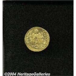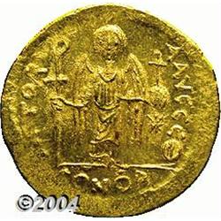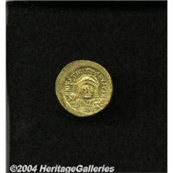 <B>Justinian I.</B></I> A.D. 527-565. AV solidus (20 mm, 4.51 g). Constantinople, A.D. 545-565. Helmeted and cuirassed bust facing, holding globus cruciger and shield decorated with horseman spearing a fallen enemy / Angel standing facing, holding long P-headed cross and globus cruciger; star in right field; (Theta)/CONOB. DOC 9i; SB 140. Good XF, obverse graffito. <BR><I>From the Geneva Collection.</B></I> <BR><BR><B>Important notice:</B> Heritage usually auctions material at the rate of 200-250 lots per hour. On some occasions eBay Live bid software or the Internet may not be able to keep up with the pace of the auction. We recommend placing a realistic absentee bid now as insurance to avoid disappointment. Occasionally the auctioneer may eliminate or reject an eBay Live bid, and the auctioneer may also reopen a lot after the close of the eBay live bidding (usually because we missed an audience bid), and may reject your bid even if it shows you as the winning bidder. By bidding via eBay Live, you agree that Heritage may award the lot to another bidder at its sole discretion under the circumstances described above or any other reasonable circumstances. Since eBay bids are not shown to us until we open the lot on the floor, we treat those bids just like floor bids. In most cases the floor responds before the eBay bid is presented to us, due to Internet lag time, so for consistency we have made it a policy that floor bids are always considered first over tie eBay live bids. Also please note that all Heritage lots purchased through eBay Live carry a 20% Buyer's Premium. Please make sure you read the Terms and Conditions before you bid.