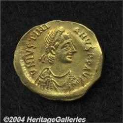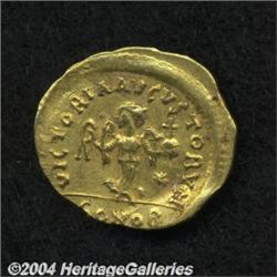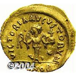 <B>Justinian I.</B></I> A.D. 527-565. AV tremissis (16 mm, 1.45 g). Constantinople. Diademed, draped and cuirassed bust right / Victory advancing right, head left, holding wreath in right hand, globus cruciger in left; star in right field; CONOB. DOC 19; SB 145. EF.<BR><I>From the Morris Geiger Collection.</B></I> <BR><I>From the Morris Geiger Collection.</B></I> <BR><BR><B>Important notice:</B> Heritage usually auctions material at the rate of 200-250 lots per hour. On some occasions eBay Live bid software or the Internet may not be able to keep up with the pace of the auction. We recommend placing a realistic absentee bid now as insurance to avoid disappointment. Occasionally the auctioneer may eliminate or reject an eBay Live bid, and the auctioneer may also reopen a lot after the close of the eBay live bidding (usually because we missed an audience bid), and may reject your bid even if it shows you as the winning bidder. By bidding via eBay Live, you agree that Heritage may award the lot to another bidder at its sole discretion under the circumstances described above or any other reasonable circumstances. Since eBay bids are not shown to us until we open the lot on the floor, we treat those bids just like floor bids. In most cases the floor responds before the eBay bid is presented to us, due to Internet lag time, so for consistency we have made it a policy that floor bids are always considered first over tie eBay live bids. Also please note that all Heritage lots purchased through eBay Live carry a 20% Buyer's Premium. Please make sure you read the Terms and Conditions before you bid.