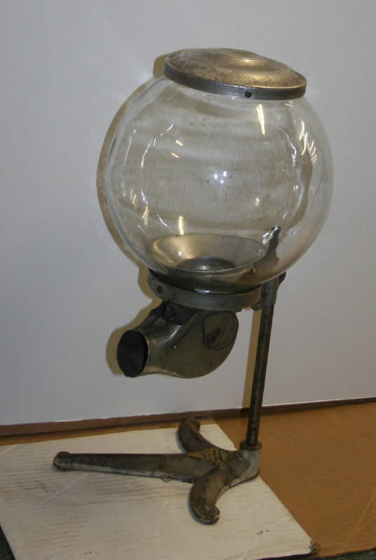 Wide mouth dispenser by Justrite Measuring Machine Co., Belvedere, IL. Stands approx 19" H on a slender column supported by a three pronged base. Press mouth to dispense nuts. Patented 1915.