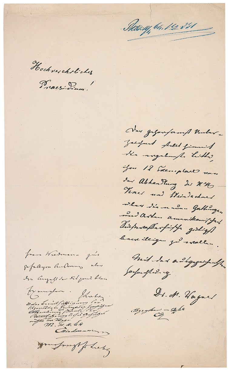 German chemist (1803–1873) and creator of the world's first scientific research laboratory. One of the premier chemistry teachers of all time, he set into motion an application of chemical principles that had a profound effect on the future welfare of mankind. ANS in German, signed “J. Liebig,” one page, 8 x 13.25, no date. Brief note written alongside an ALS from German zoologist and explorer Moritz Wagner. Wagner asks the Praesidium to send him 12 copies of Vines and Steinacker’s treatise on the Genera and Species of American Freshwater Fish. Liebig pens a four-line untranslated note to the lower left to Wiedmann inquiring as to how many copies are available. Beneath Wiedmann’s reply Liebig signs again, “approved Fr. Liebig.” In very good condition, with central horizontal and vertical fold, scattered creasing and wrinkling, a couple small edge tears, and some mild toning.