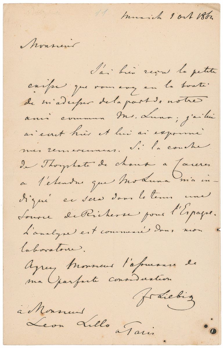 German chemist (1803–1873) regarded as one of the greatest chemistry teachers of all time, and also known as the ‘father of the fertilizer industry’ for his discovery of nitrogen as an essential plant nutrient. Untranslated ALS in German, signed “J. Liebig,” one page, 5.5 x 8.75, October 1, 1864. Central vertical and horizontal folds, one tiny hole, and scattered spots of stray ink to lower portion, otherwise fine condition.