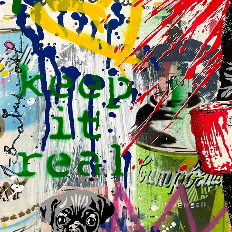 "Juxtapose" is a mixed media original on deckle edge paper by Mr. Brainwash, hand signed and bearing the thumbprint of the artist inverso. This piece comes custom framed. Includes Certificate of Authenticity. Measures approx. 34" x 26" (frame), 30" x 22" (image).