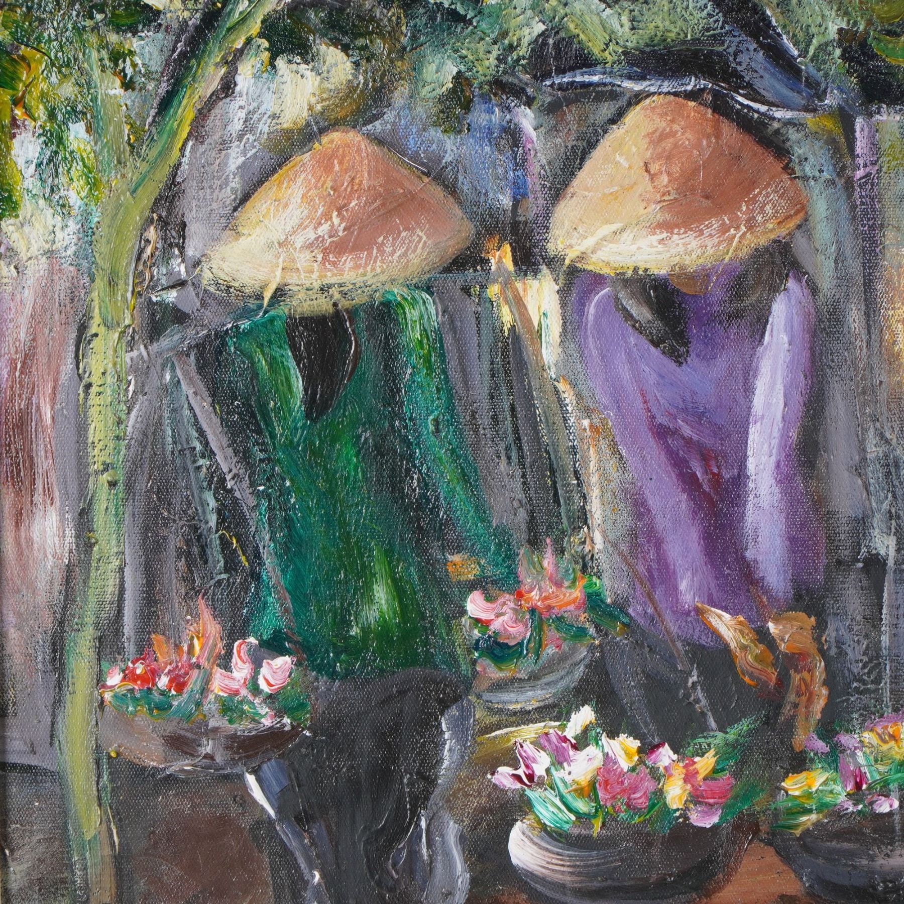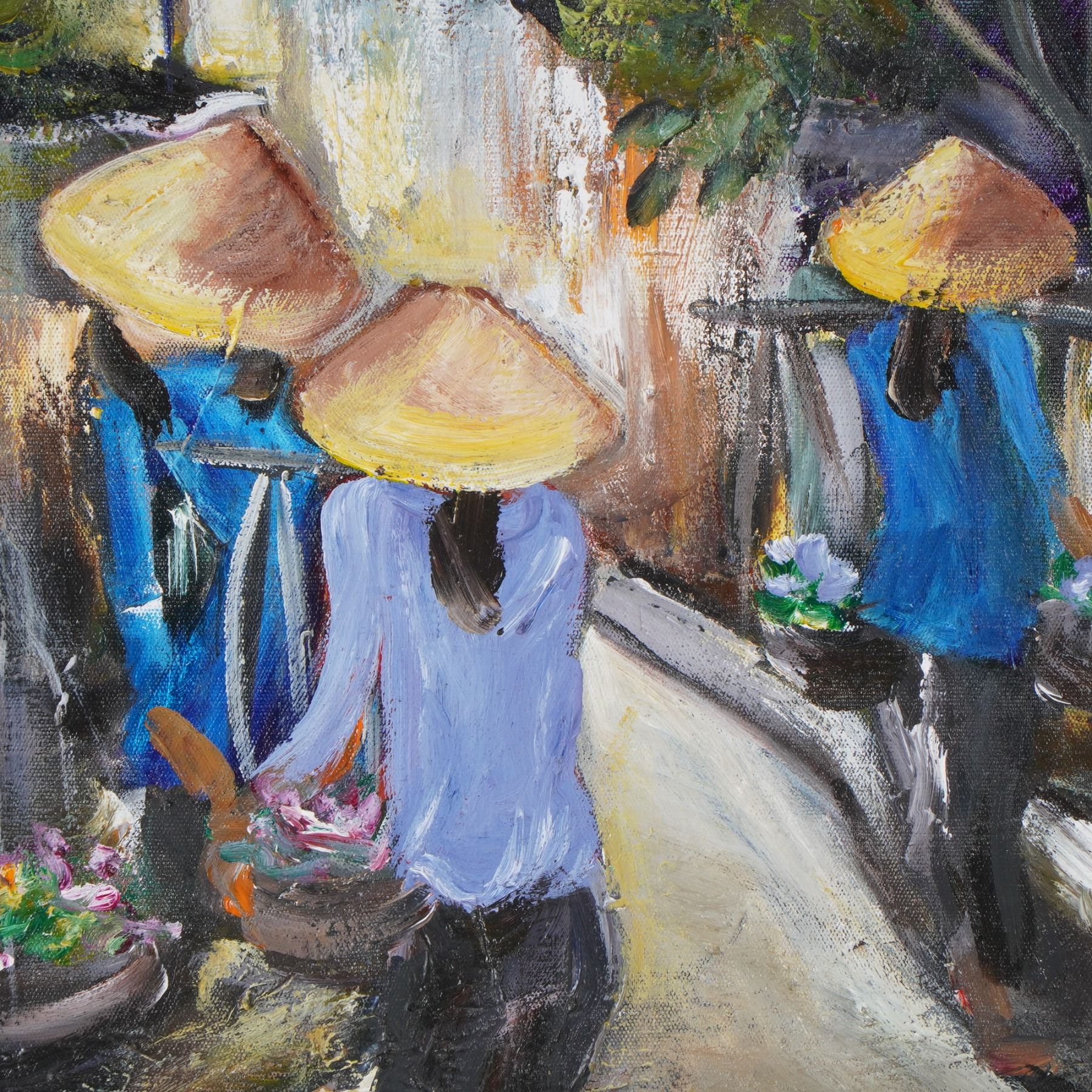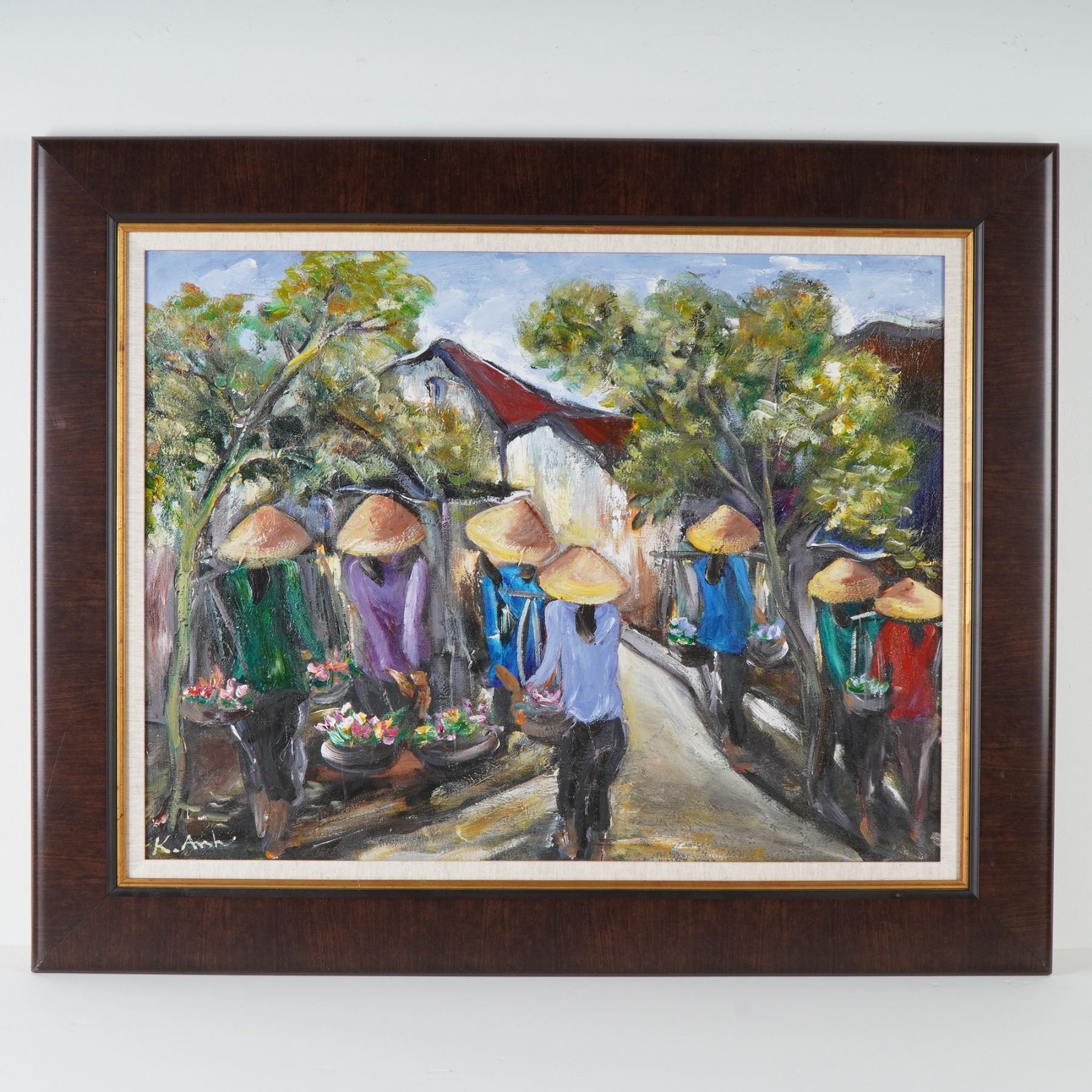 A vibrant and expressive oil painting on canvas depicting a bustling street market by Vietnamese artist K. Anh who often explored themes of identity and culture by blending traditional elements with modern techniques. The composition captures a snapshot of Portobello's historical street market where a procession of figures wearing traditional conical hats, balancing baskets of flowers as they move along the winding famous path. Rendered in rich impasto with confident brushwork, the piece conveys both the movement and warmth of daily life in rural Vietnam. The color palette, featuring lush greens, vivid blues, and soft lavender tones, contrasts beautifully against the earthy architecture and sunlit sky. K. Anh participated in multiple international exhibitions and his art remains celebrated in galleries and private collections. Presented in a handsome wooden frame with linen liner and wire for hanging. A lively and textured work that celebrates cultural tradition and artisan life. Signed K. Anh at the lower left.