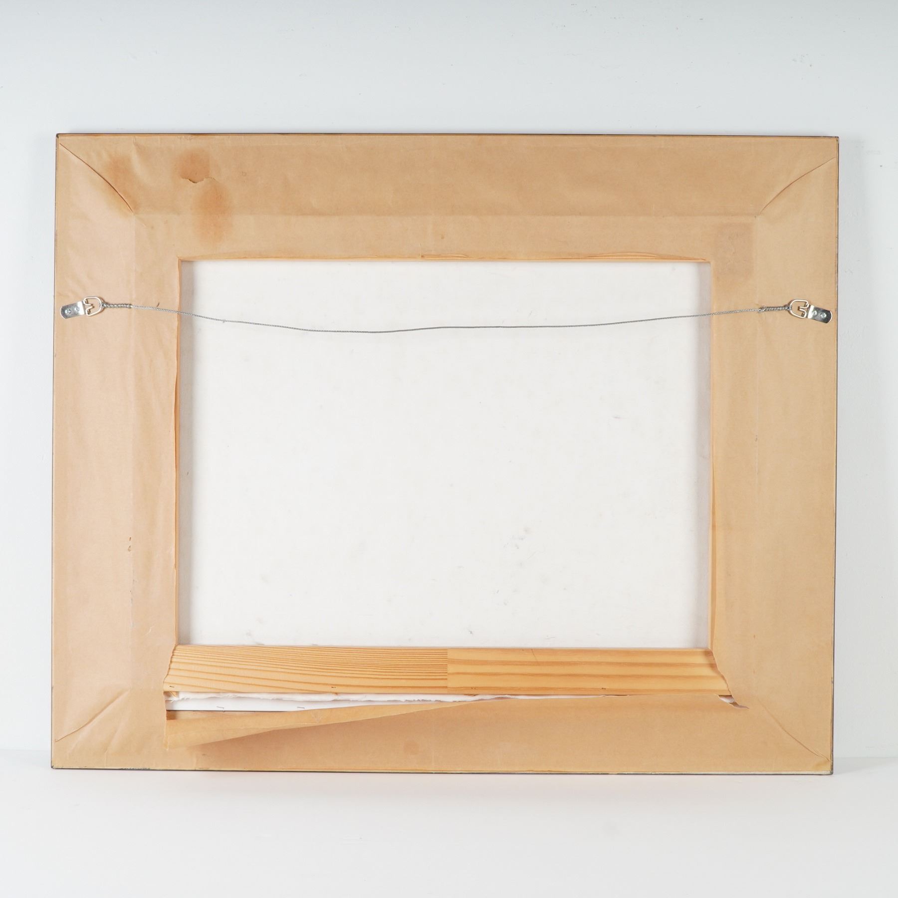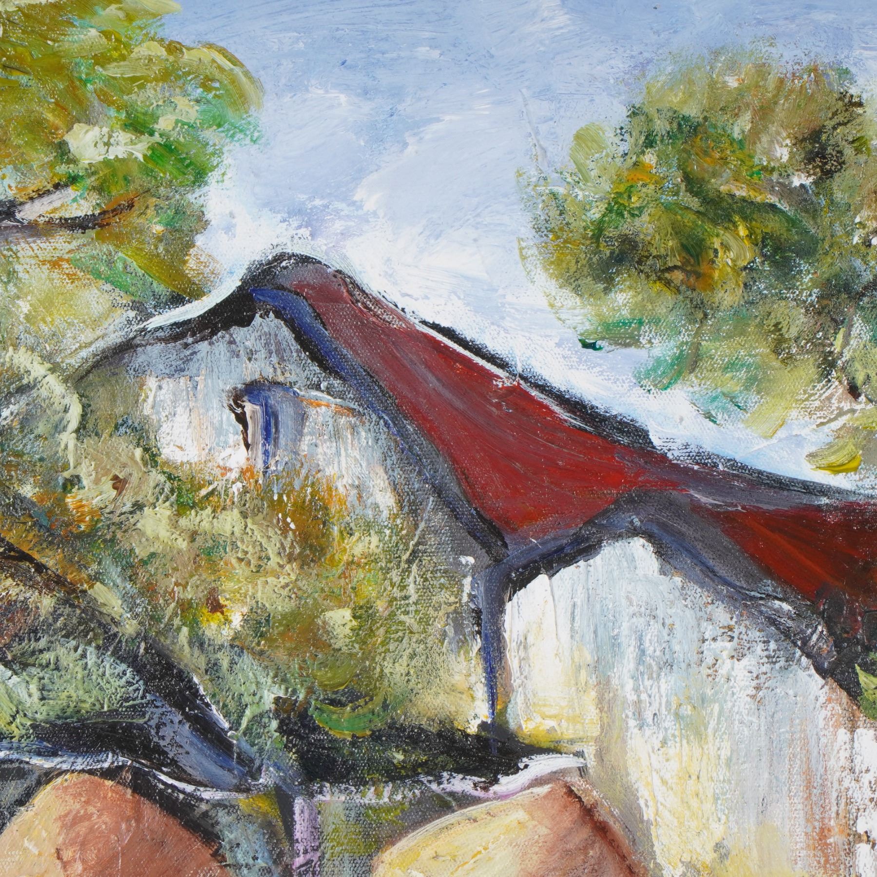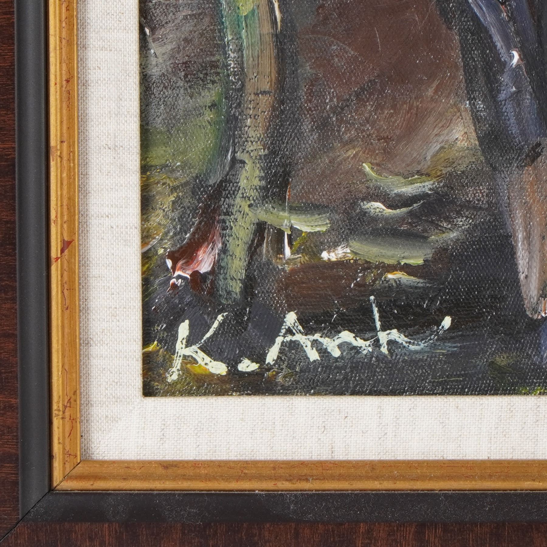 A vibrant and expressive oil painting on canvas depicting a bustling street market by Vietnamese artist K. Anh who often explored themes of identity and culture by blending traditional elements with modern techniques. The composition captures a snapshot of Portobello's historical street market where a procession of figures wearing traditional conical hats, balancing baskets of flowers as they move along the winding famous path. Rendered in rich impasto with confident brushwork, the piece conveys both the movement and warmth of daily life in rural Vietnam. The color palette, featuring lush greens, vivid blues, and soft lavender tones, contrasts beautifully against the earthy architecture and sunlit sky. K. Anh participated in multiple international exhibitions and his art remains celebrated in galleries and private collections. Presented in a handsome wooden frame with linen liner and wire for hanging. A lively and textured work that celebrates cultural tradition and artisan life. Signed K. Anh at the lower left.