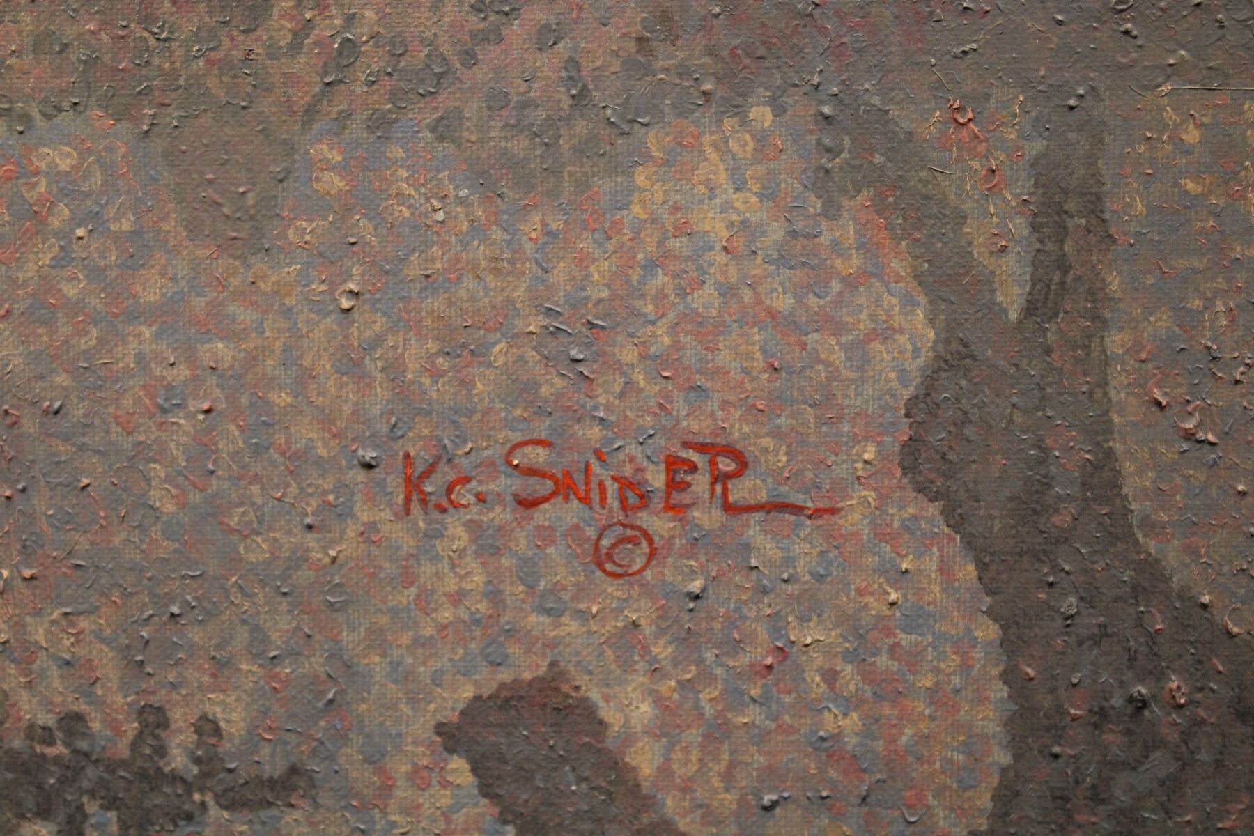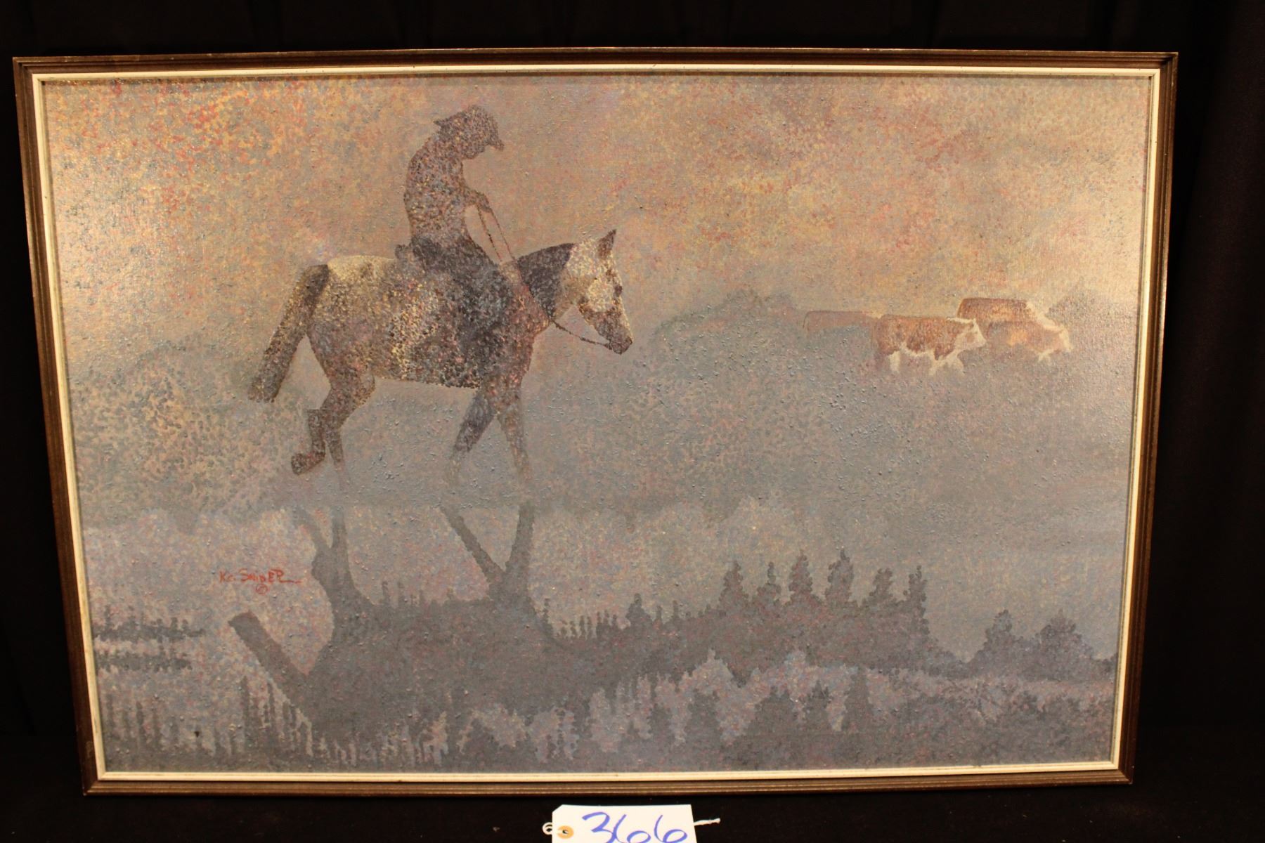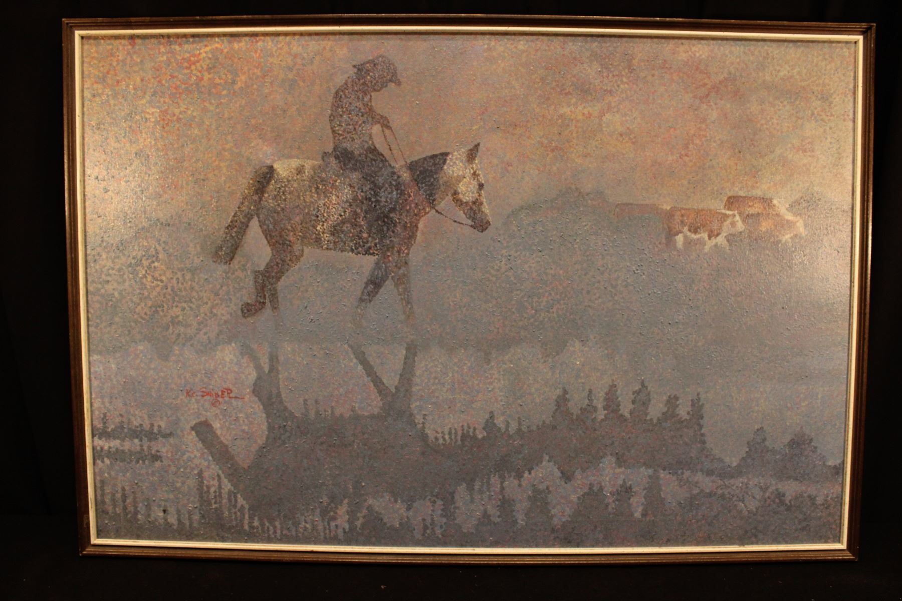 Listed artisted KC Snider Pointillism style oil painting of cattle drive. 37" x 25" / 35.5" x 23.5"
