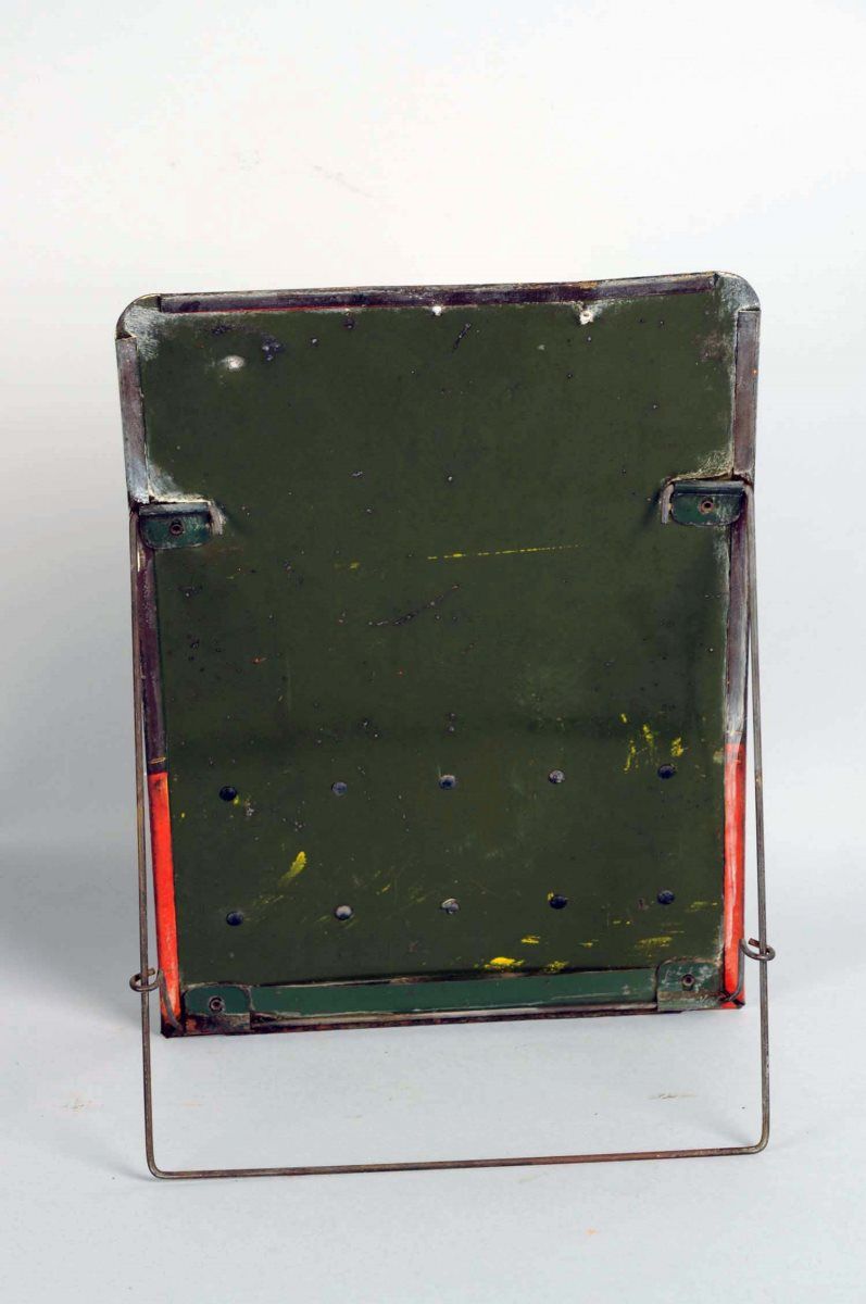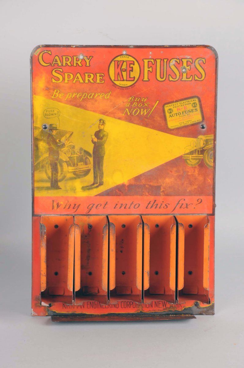Tin display features slats for product & litho scene with police officer and broken down car, reads "Why get into this fix?" by Kirkman Engineering Corp. New York. Has some wear around edges but very nice early artwork. Condition (Very good). Size 12.5" x
