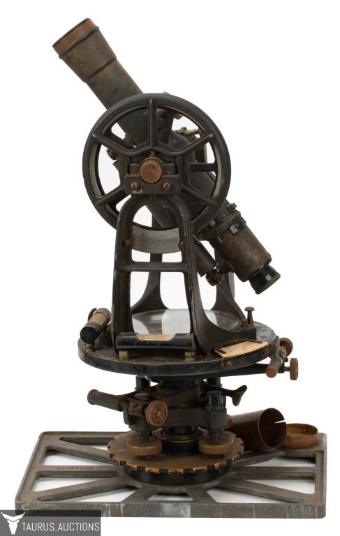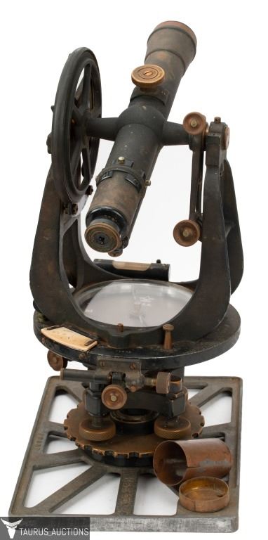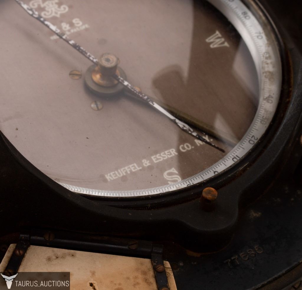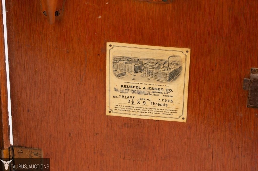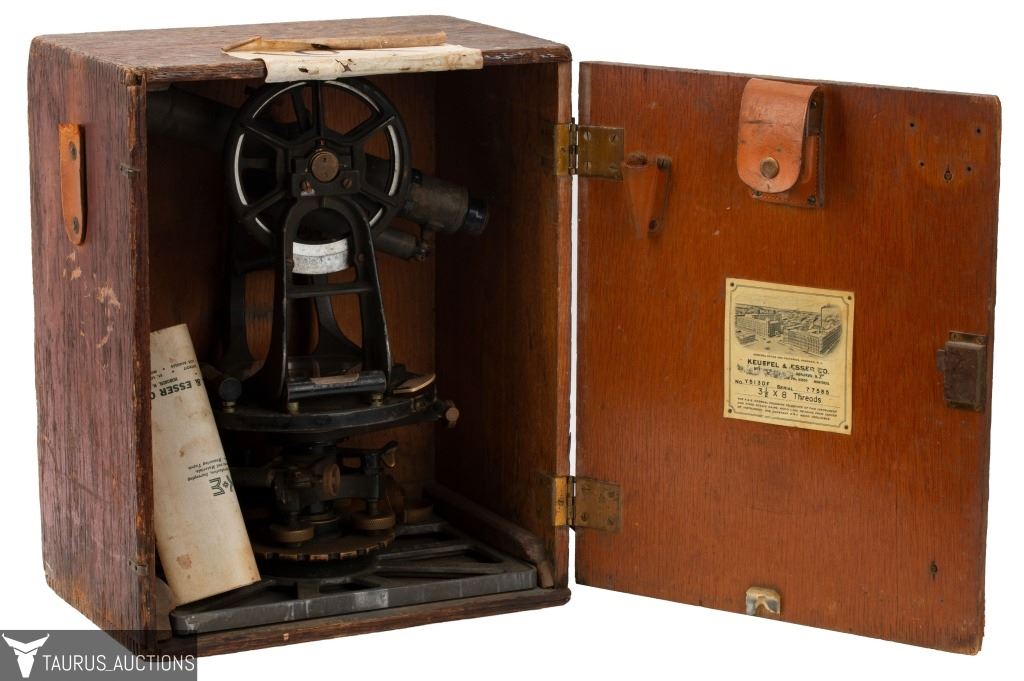 Item/Description: Vintage K&E Builders' Transit Level survey tool in original wooden case. Product label reads in part: Keuffel & Esser Co. No. Y513OF Serial 77585 3 1/2 x 8 Thread. Also includes User Manual for NP5153 Builders' Level & NP5155 Builders' Transit-Level. Leather pouch attached to the inside of the door is holding four tools. (Engineer)