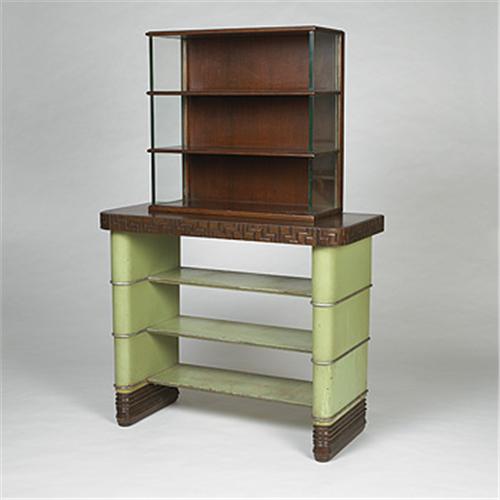K.E.M. Weber KEM Weber Group sideboard Grand Rapids Furniture Company USA, c. 1928 walnut, lacquered wood, glass, silver leaf 36"w x 16"d x 54"h The Kem Weber sideboard from 1928 is a striking example of Art Moderne design. Weber simplified traditional furniture forms and added bold detailing that emphasizes the horizontal. He achieved a subtle interplay of color and form by combining his signature "Sage Green" lacquer with delicate touches of silver leaf. The rich walnut frieze with zigzag decoration balances the overall effect of the color treatment and adds spare ornament to the otherwise severe form. The horizontal emphasis and the rounded corners of the lower table anticipate the streamline style that came to define the 1930s. A matching serving table from this series is in the collection of The Art Institute of Chicago. Literature: Furniture Record, Sept. 1928, pg. 62 Museum Studies, The Art Institute of Chicago, pg. 45